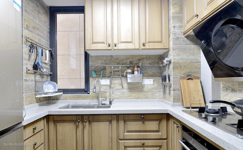原本不大的厨房设置了U型灶台,嵌入式冰箱+高颜值吸油烟机+木质橱柜柜门+墙壁挂钩节省空间,功能布置合理有序,空间利用井井有条,既保持了台面的干净整洁,还不会觉得拥挤。