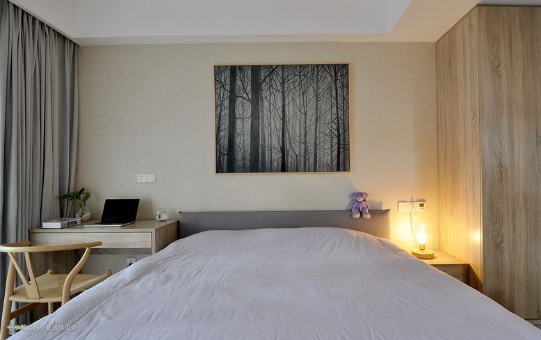卧室就是睡美美的觉的地方,安静舒适就是最大的要求,木质的床体木质的柜子和木质的书桌让整个卧室看上去十分的清爽,床头灯打开之后泛着暖暖的灯光,与米黄色的墙壁和木质的衣柜相得益彰,视觉上非常温暖;整体非常朴素干净,没有多余的装饰,但是扑面而来的生活气息还是能让人在这压力大的现代生活中得到一丝慰藉。
