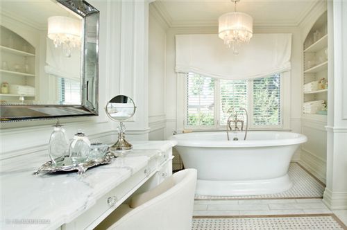 这款欧式浴室装修中,浴室的台面采用白色的大理石材质打造,搭配银色金属知更的镜框显得高贵大气,椭圆形的白色浴缸旁内嵌式的置物格能存放一些洗浴用品和装饰物,简单实用.