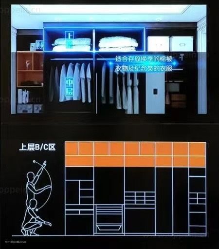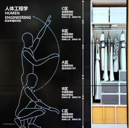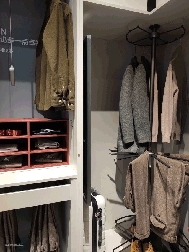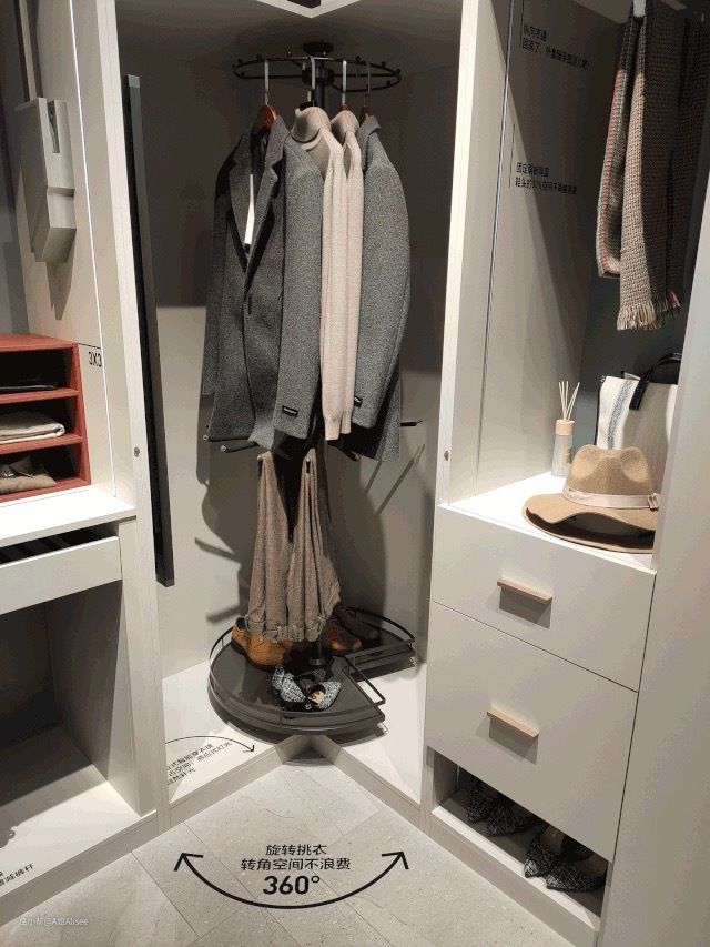 360°转角空间不浪费;上层挂衣区、中层裤区、下层鞋包区,按照动线,这样放置衣物,就可以竟然有序的拿取。