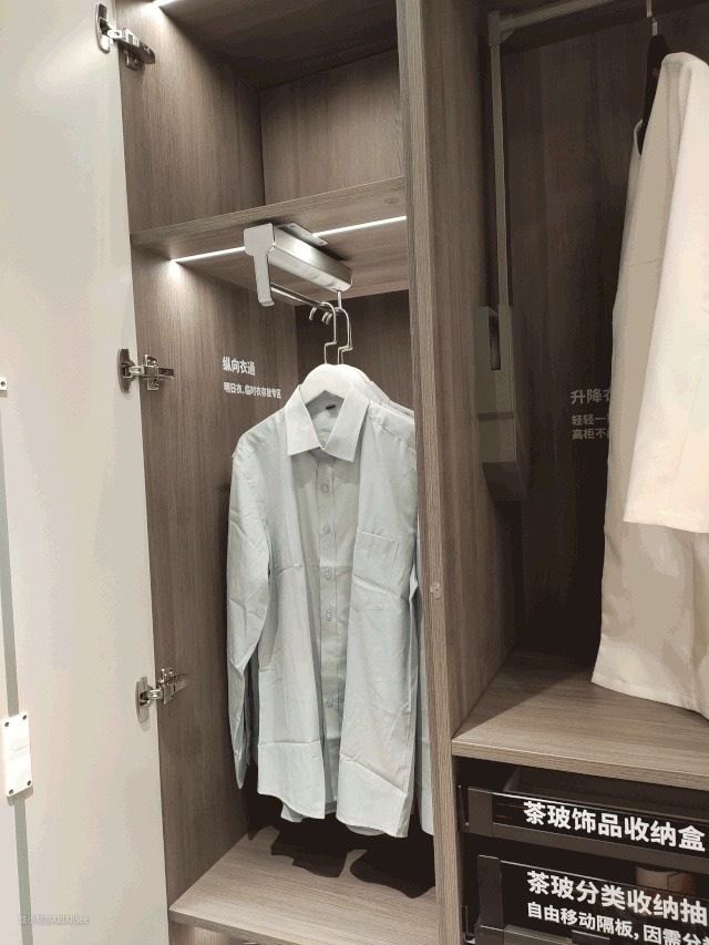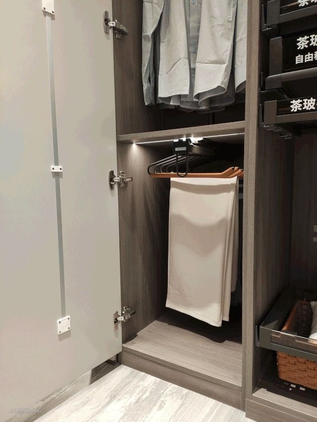 节省柜内空间,感应式灯光,感应灯光真的太提升生活品质了,尤其很多衣帽间都是密闭的,柜子里面总是有些死角,灯光照不到,如果柜子里有安装感应式灯,即节能又方便找衣物。
