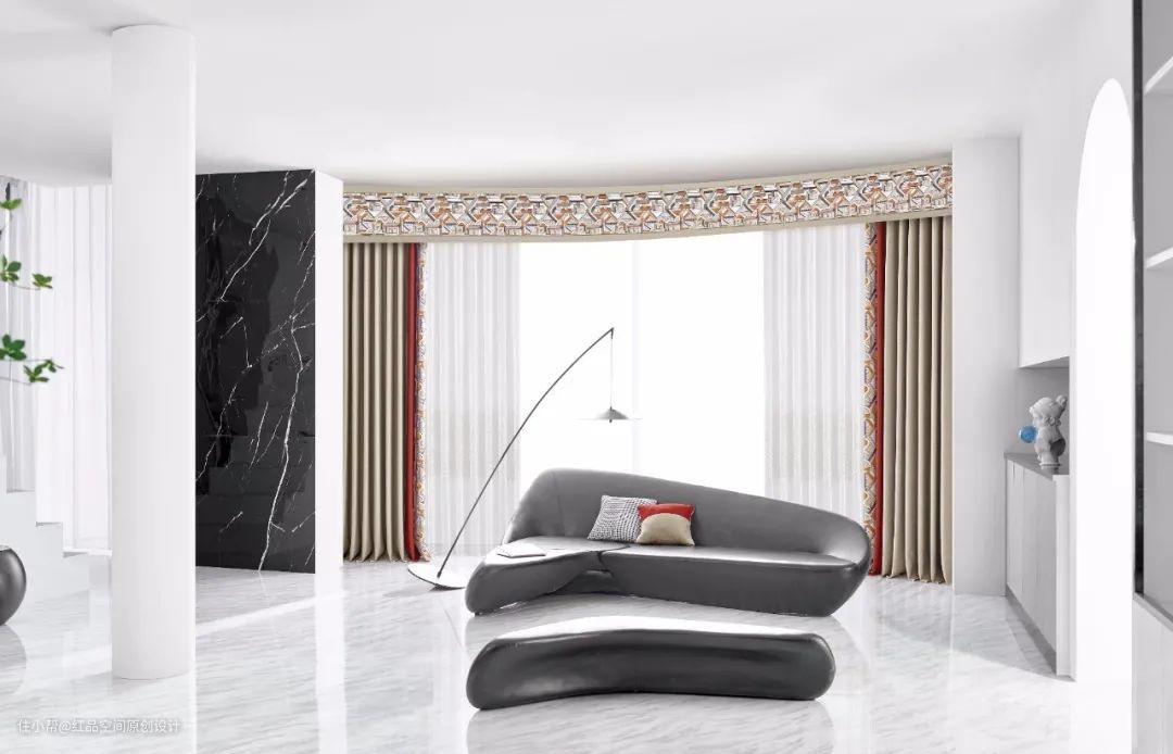 4、当然,纱帘的花纹也要与主布相对应。如果使用了类似花纹复杂华丽的窗帘,一定不能配同样复杂的,会显得空间特别繁杂,层次感也没有拉开。