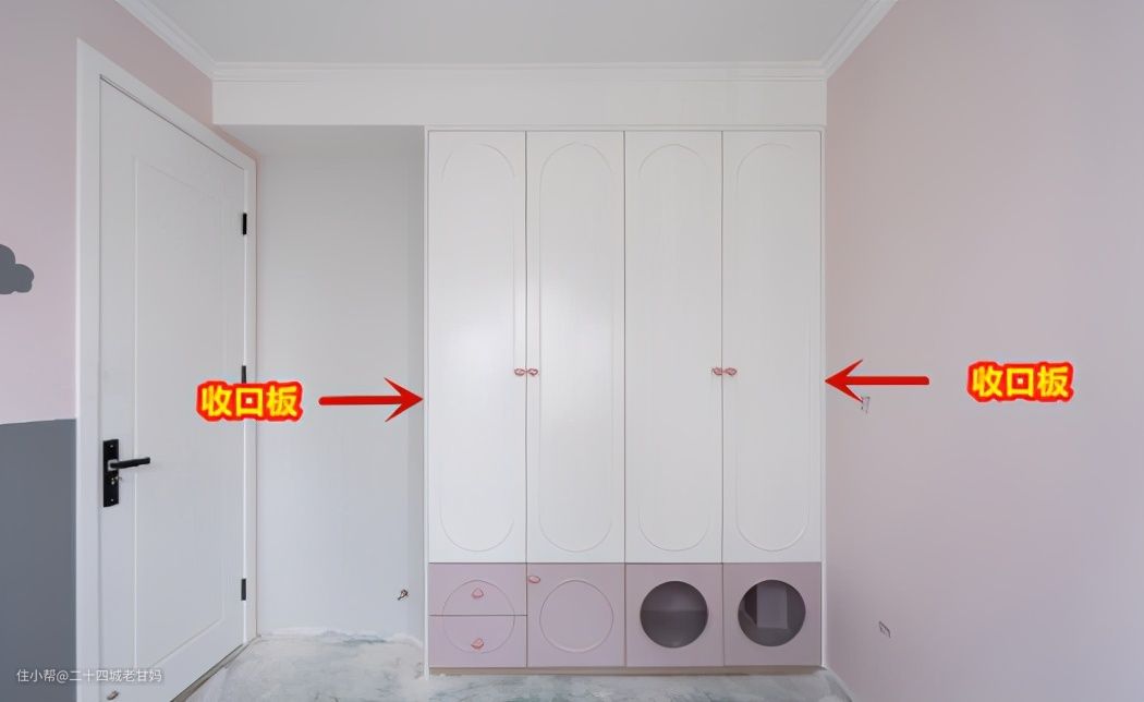 而且加了收口板之后,在柜子不靠墙的那一面还能充当柜子的防护层,底部还能在收口板上走一圈踢脚线,这样还能起到一个保护作用。