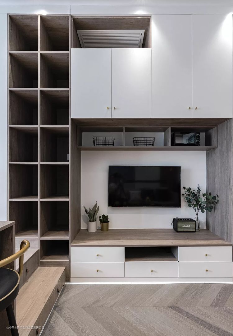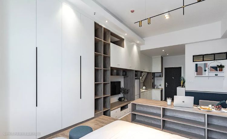 电视墙则是定制的收纳柜,连着橱柜及衣柜,提供了超强的收纳功能,美观实用兼具。