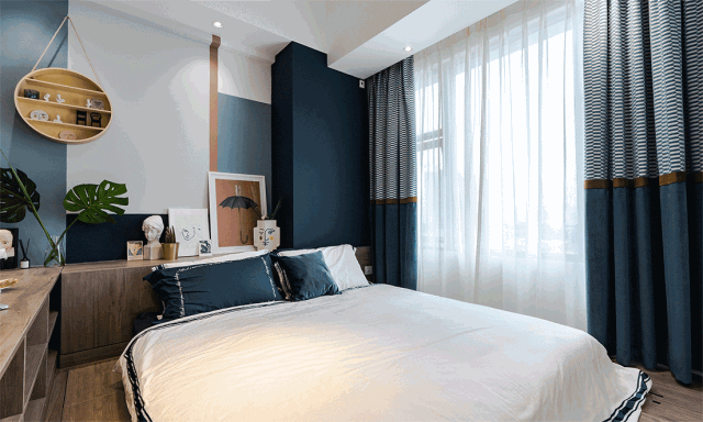 吧台的另一侧就是卧室,蓝白色床品与整个空间色系完美融合,看似沉静,实则暗藏玄机。