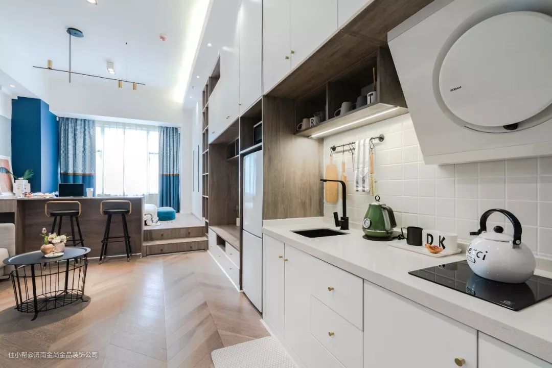 进门右手边就是开放式厨房,采用L字型的橱柜布局,把冰箱也嵌入到柜体,充分利用了空间。
