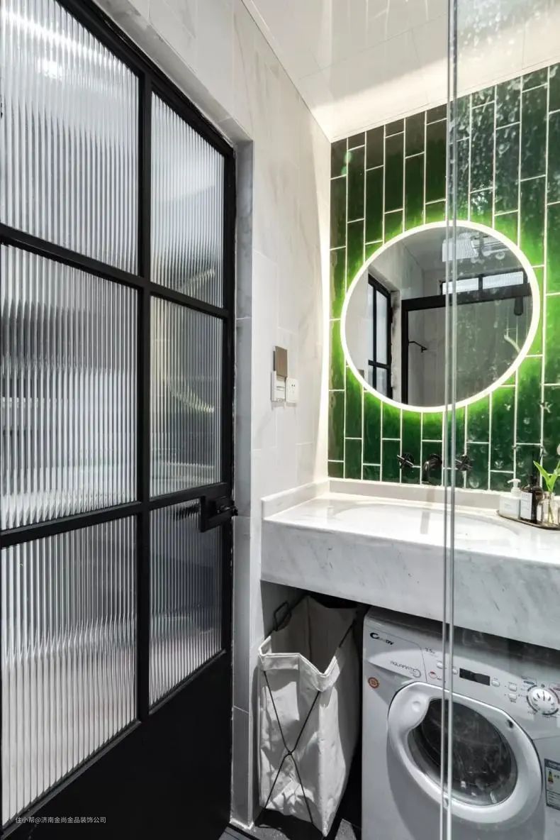 定制的白色洗手台,下面嵌入洗衣机,上面选择墨绿色瓷砖+隐藏灯带,美观与实用兼顾。