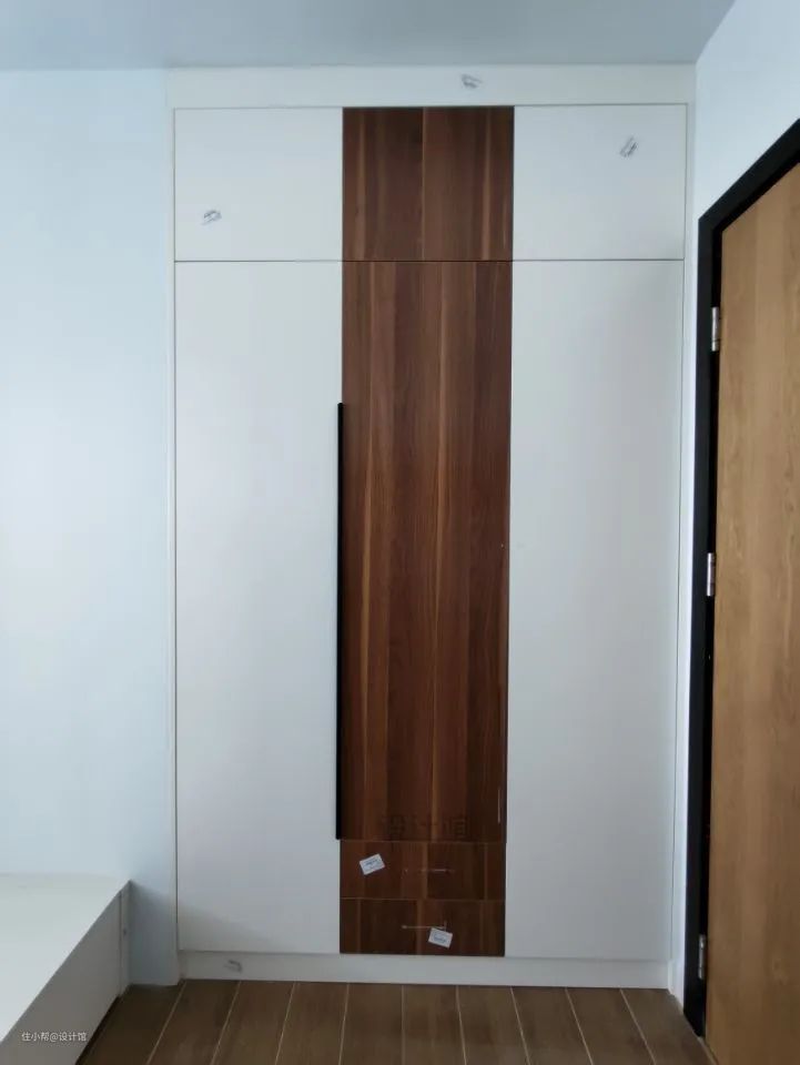然后柜子做吊顶的话,顶上也要留5-10cm的封板,这样做的缘由是:一是衣柜门不可能贴着天花顶的,怕层高有不平的地方,留出一点空间装封板,可以灵活控制收口;二是有些定制柜安装的时候,是组装好了再推进去的,贴得天花太紧就很难推进去了。