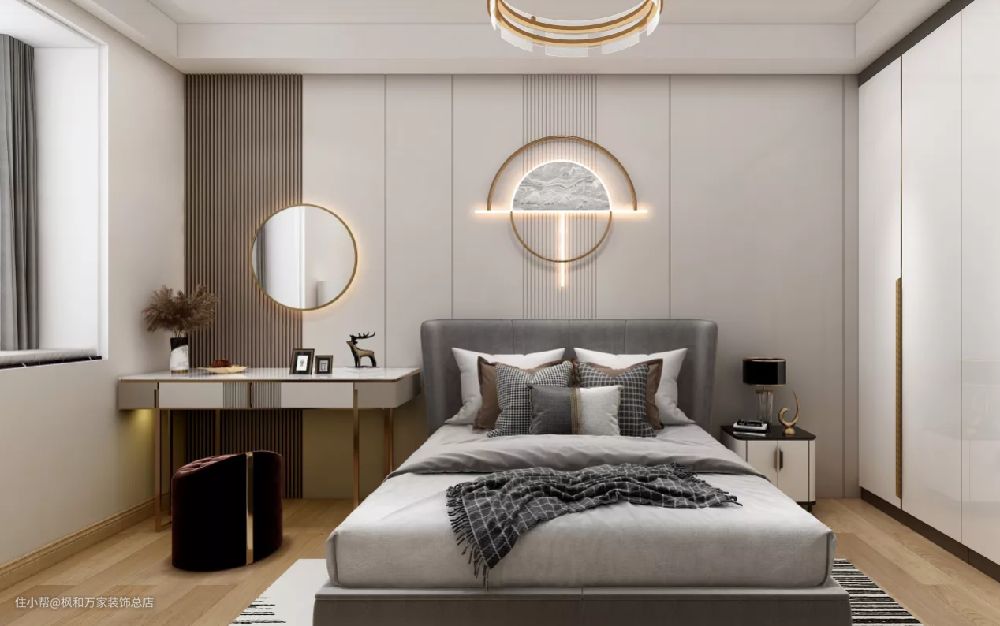 背景墙上加入金属边框的造型,中式的圆形装饰画,布置灰色的布艺床,也让空间显得更加轻奢雅致。