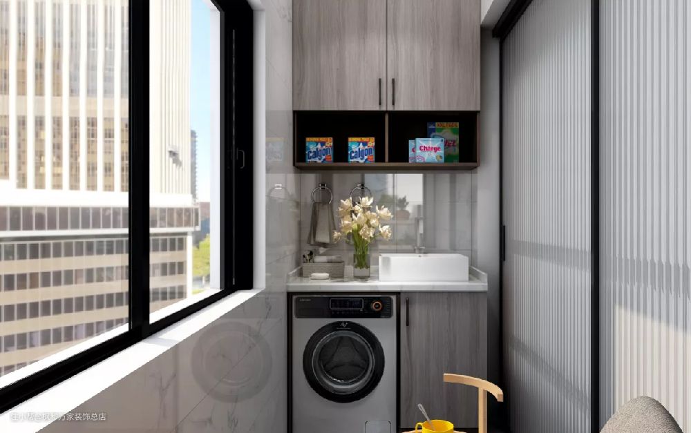 阳台较为实用的设计,嵌入式的收纳柜储物能力极强,还为洗衣机预留了空间。