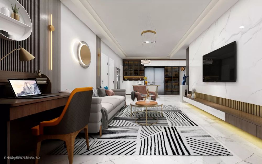 客餐厅通铺大理石纹瓷砖,木质+大理石沙发背景,呼应大理石电视墙, 奠定了整个空间优雅质感的空间格调。