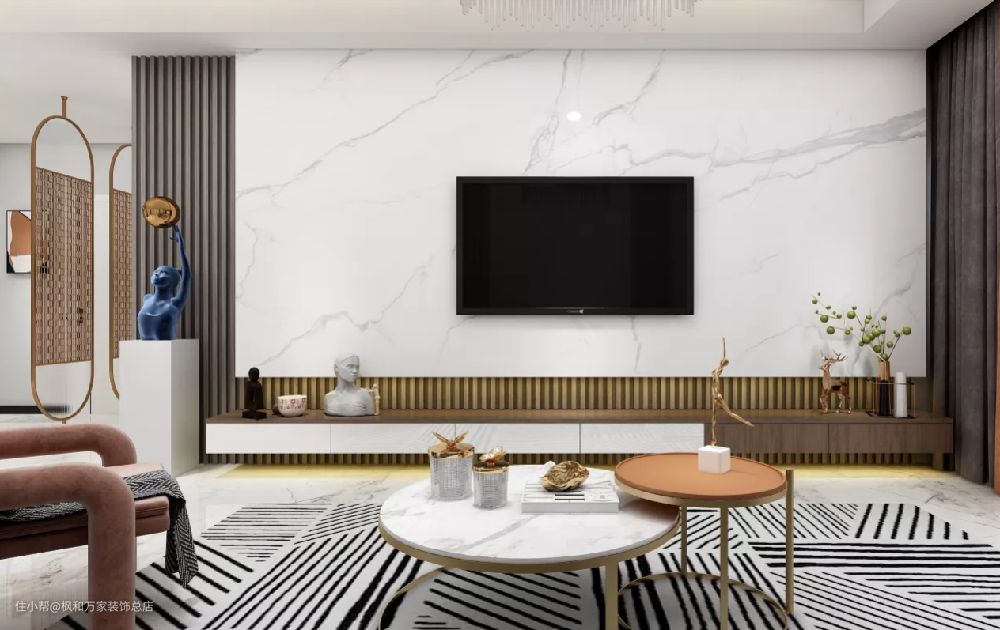 木纹搭配大理石电视背景墙,底部悬空安装木色+白色电视柜,简约省地方。