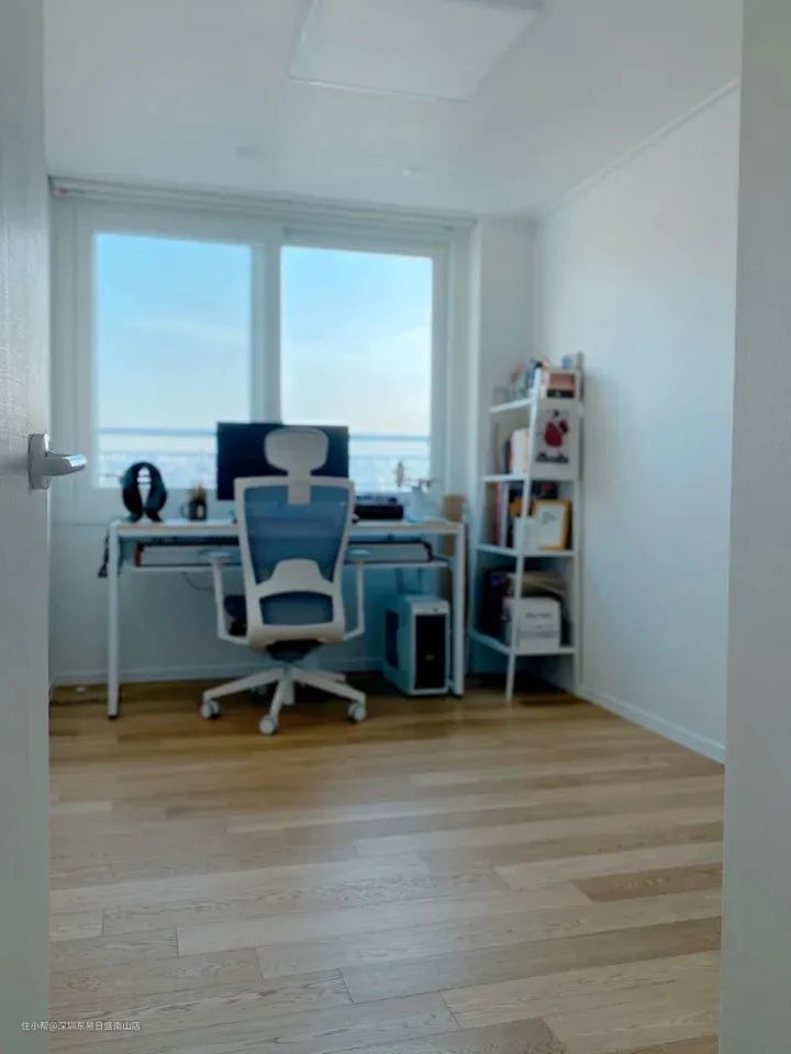 关上百叶窗,柔和的光线照射进来,太舒服了。书桌下面还藏着电子琴,高效利用空间。