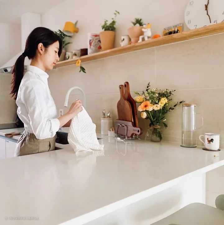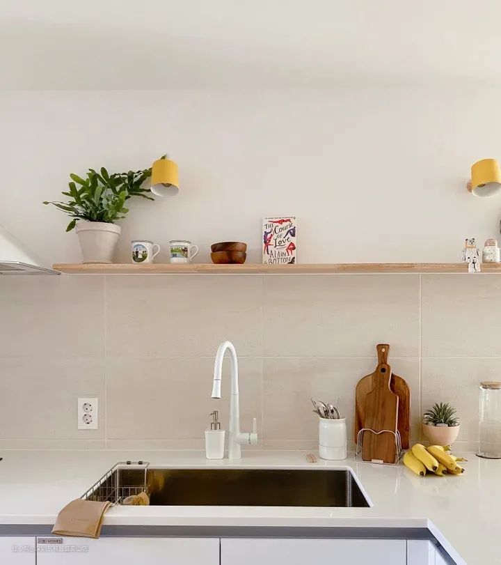 厨房没做太多吊柜,因为暂时够用,也是为了当时装修节约预算。未来杂物变多,其实可以把层板改成柜子,再添加也不迟。层板主要起到装饰作用,随意摆放小物件,就能充满生活气息。