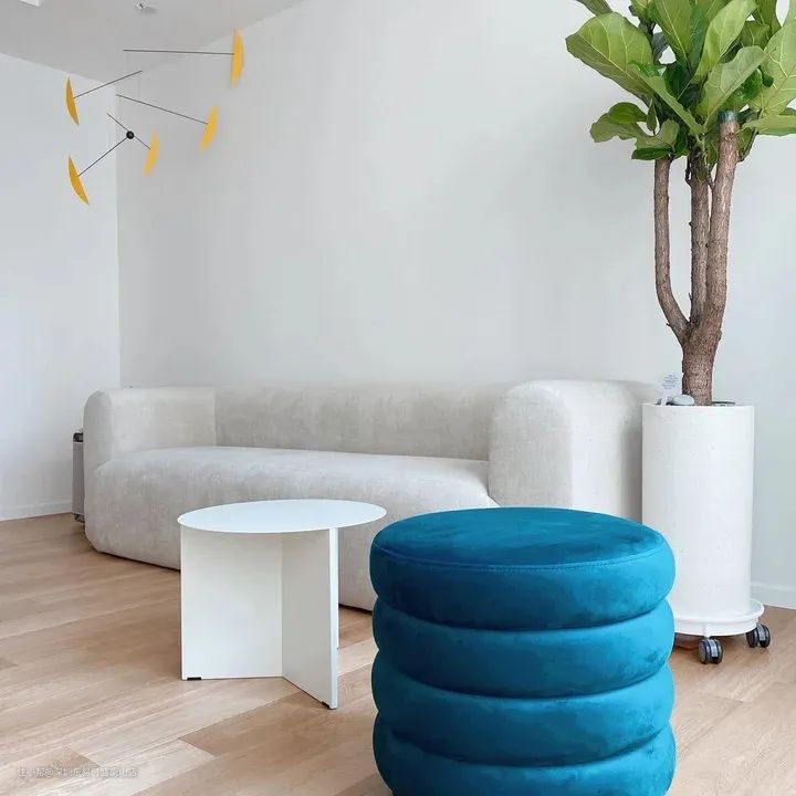 白墙给人无限遐想,也拥有非常自由的搭配度,留白或是装饰挂画都很漂亮。面包造型的无腿沙发,呈现一种轻松简洁的气息,一旁点缀阔叶绿植后格外清爽自然。