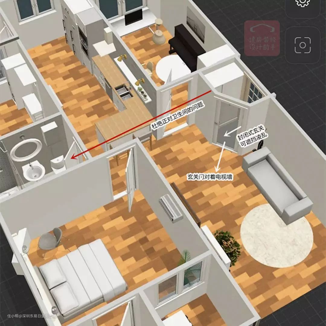 - 缺点:两个次卧面积很小,厨房也餐厅都很小,大门正对厕所门。