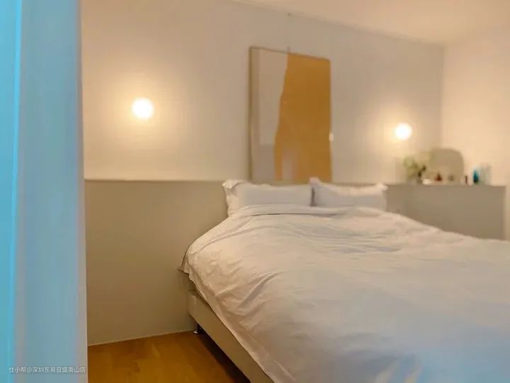 床头柜呢?直接省了,顺便也舍弃了成品的床头靠背,一体式半护墙板更简洁更大方,对比成品家具更好打扫。杯具、手机充电放在哪?
