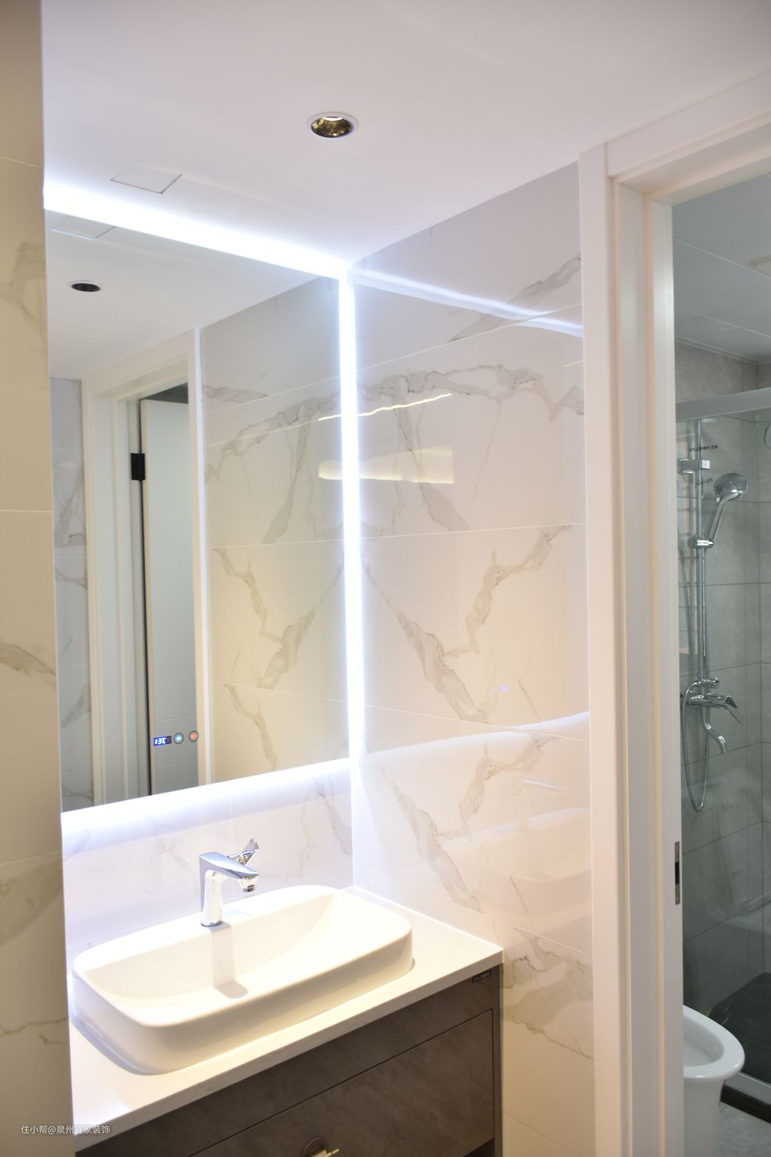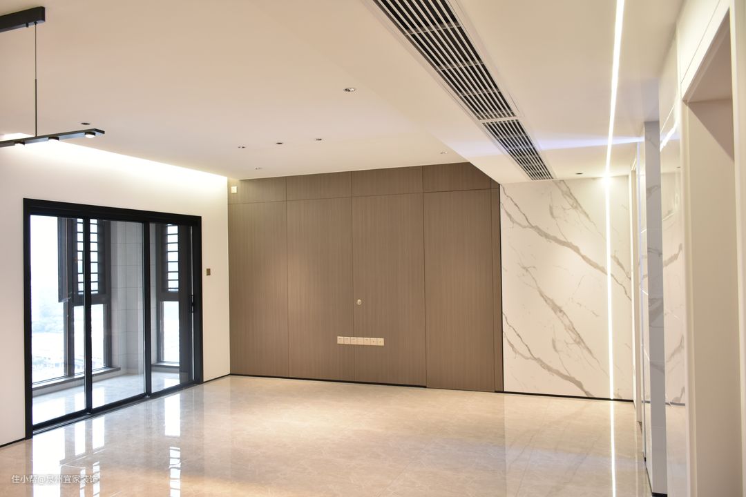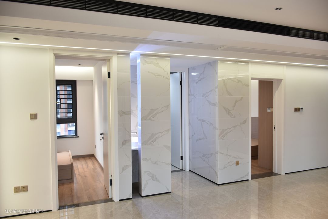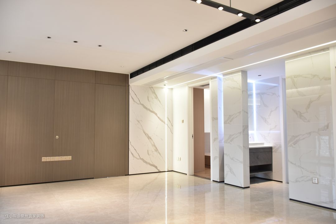 客厅电视背景墙,考虑到空间的问题,做了隐藏式的主卧门,改变了之前留的一个走廊位置,扩大了主卧卫生间的空间,达到了空间最大化的利用。
