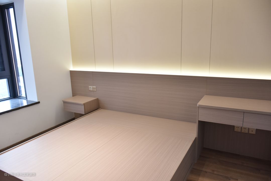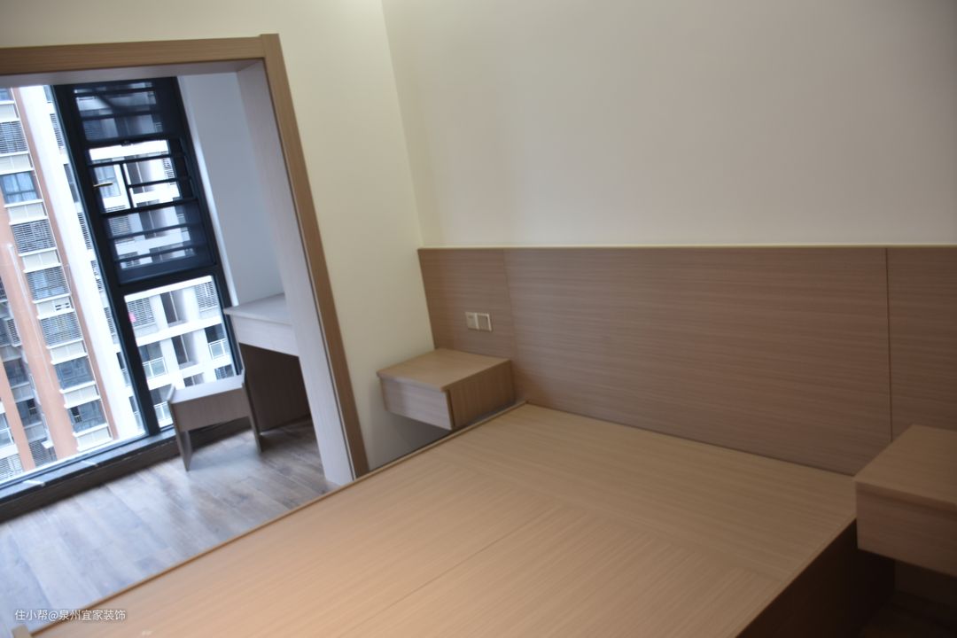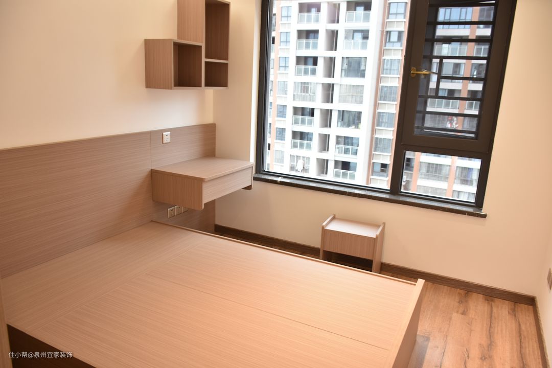 三个卧室均使用板材做的床,造价便宜,使用方便,窗下有设计推拉橱柜可以存放衣物被褥等物品。