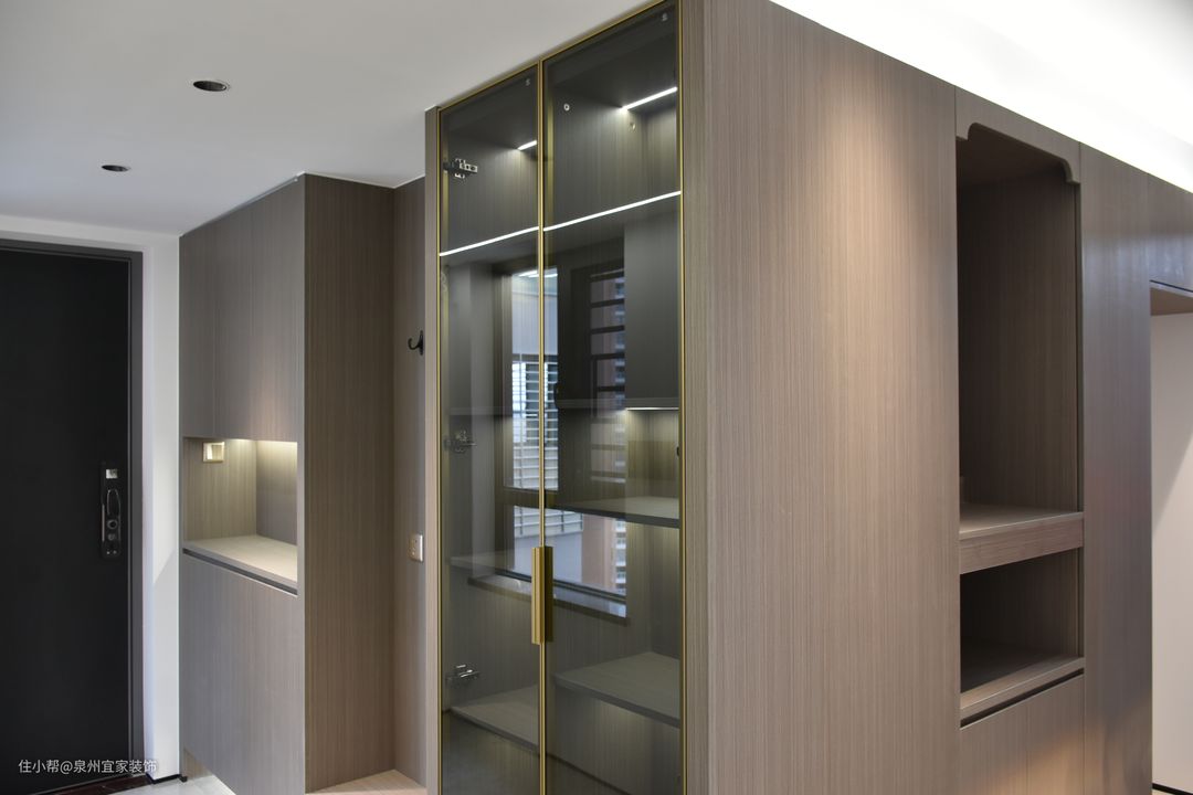 门的位置本来是远离,北部的墙,进门之后右手边有窗户,正常鞋柜会放在右手边窗下,但是空间感就会被打乱,设计师通过向北部调节门的位置,即留出了窗户的空间,也在进门的左侧做了橱柜,挂衣架和透明橱柜,一举两得,空间开阔格局更大了。