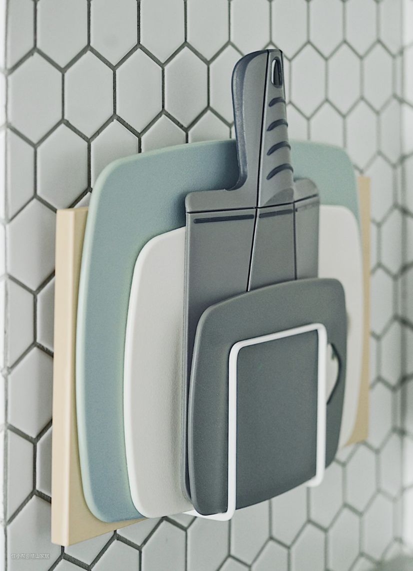 厨房砧板直接放台面上又不好收纳怎么办呢?用砧板置物架,壁挂粘贴在墙面上。