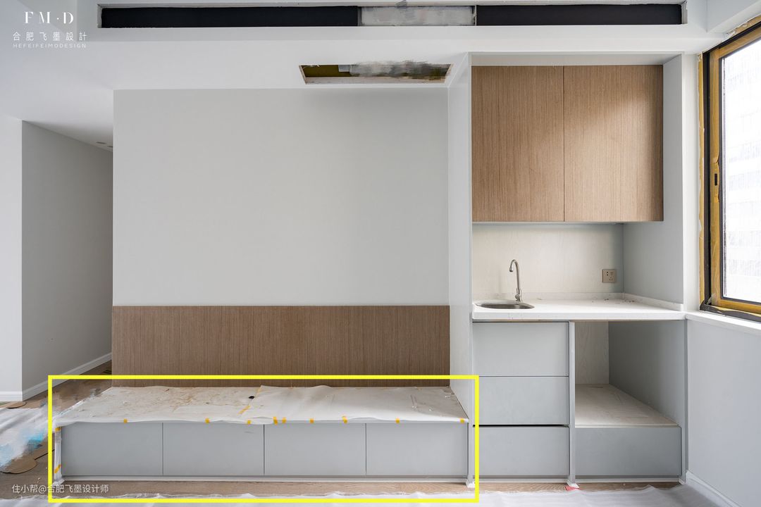 这个餐厅目前还处于硬装施工阶段,所以餐桌还没安排上,不过靠墙位置却让木工提前打了一排卡座+连体柜,卡座可以作为餐椅,基本上一口气坐五六个人是没问题的,而且铺上软垫舒适感也极强。