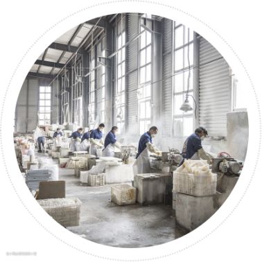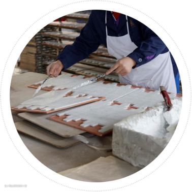以石材马赛克为例,制作工艺为:选材→石材颗粒加工→水刀切割→零件打磨→拼铺→粘网→晾干→质检→包装。