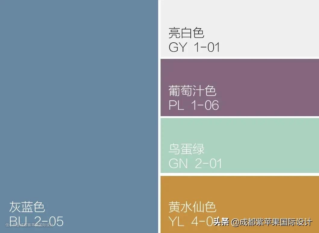 搭配2:灰蓝色+亮白色+葡萄汁色+鸟蛋绿+黄水仙色