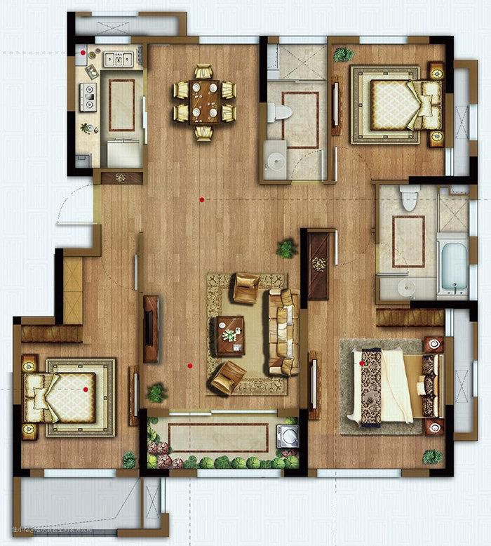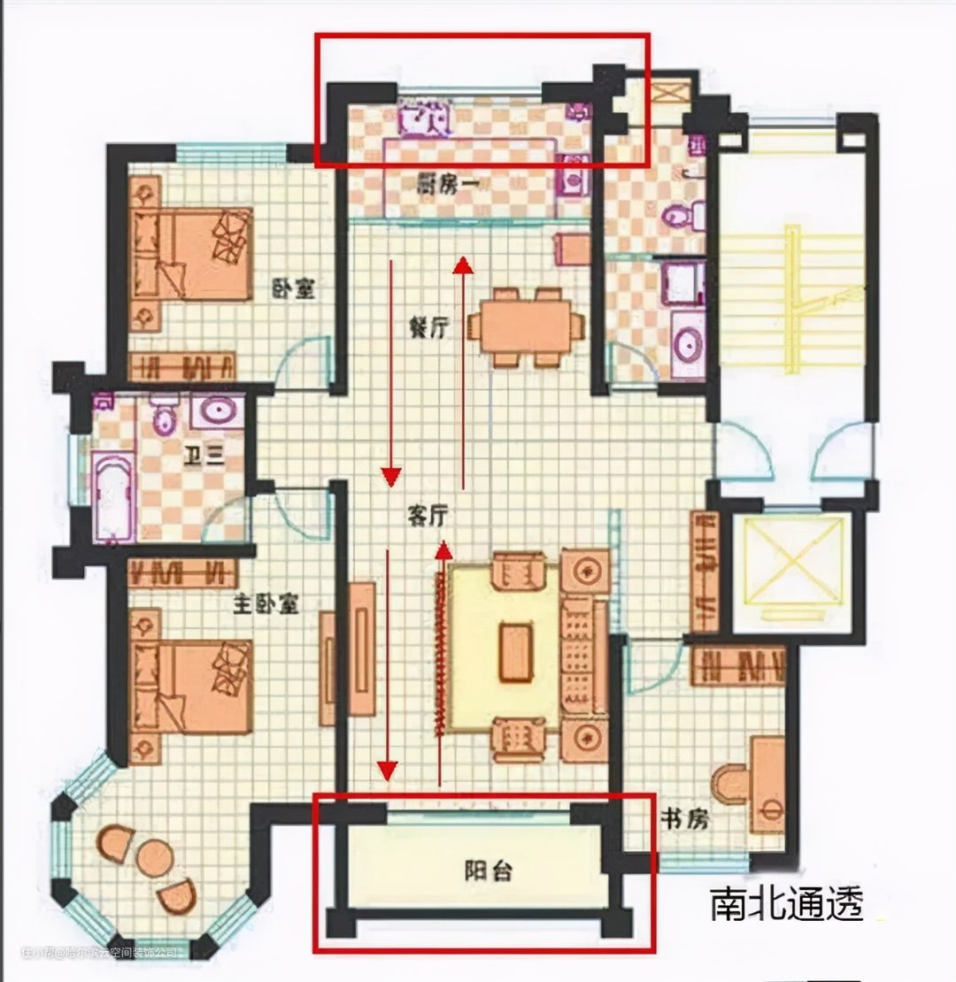 空间通透的户型,当然最好是客厅和餐厅贯穿南北,然后结合“五明” ,即五区有窗户的原则。这种户型居住更加明亮,夏季南北通风,空气流通也更好,室内不易引起有害细菌聚集,大大降低了生病的可能性。