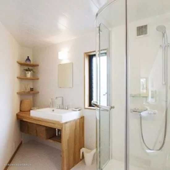 如果卫生间空间太小,放不下洗漱台,可以直接将盥洗区移到卫生间外部,内部保留淋浴区和马桶区,这样布置起来也很方便,既能轻松实现干湿分离,也能让里面的空间不那么逼仄。