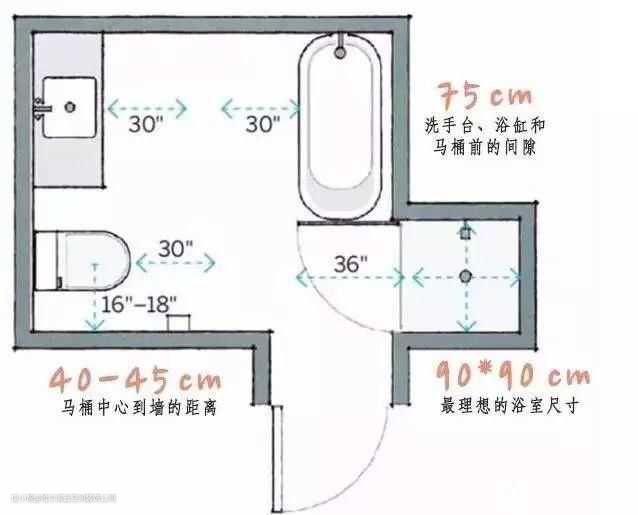 2. 卫生间整个平面布置,卫浴洁具之间最理想的空间距离,参考下图