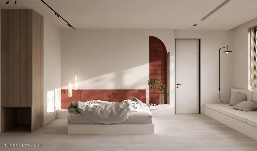 卧室壁龛兼容了床头柜的功能,适合没地方放床头柜的小户型。不过,需要注意,东西放少点,多了会不好看,也会有掉落隐患: