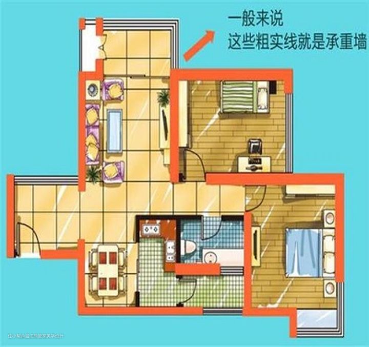 承重墙一般在开发商给出的图纸中是加粗的墙体,多为黑色粗实线,在上图为橙色加粗的墙体,承重墙承受着上部楼层的重量,坚决不能破坏其机构,否则可能会带来安全隐患。