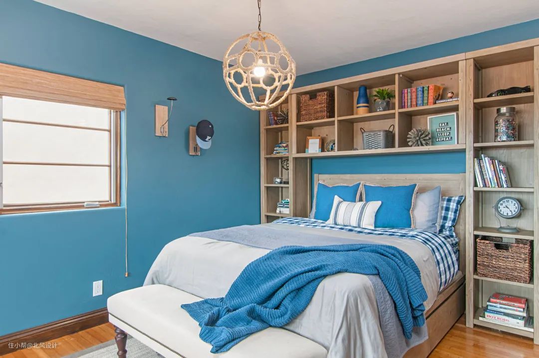 这是一间蓝色的男孩卧室。十几岁的男孩清爽有朝气,清爽而富有层次的蓝色卧室与之十分相称。房间内使用了大量木质家具,利用木材的天然纹理作为装饰。景泰蓝虽然只是作为点缀色出现,少而精。