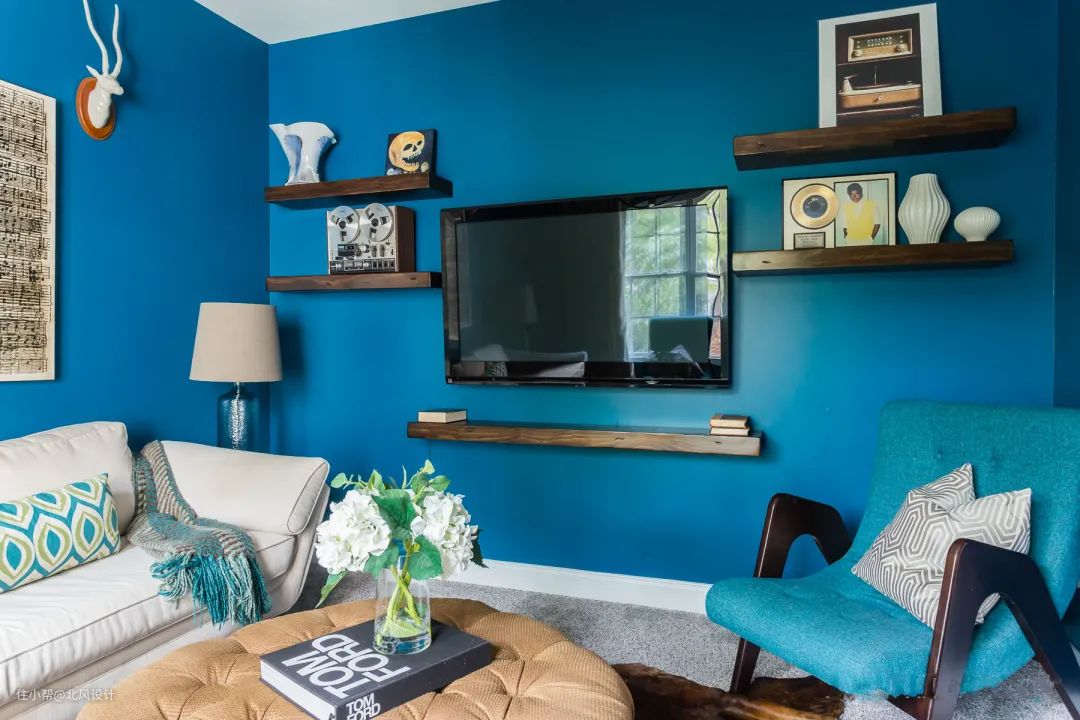 这是间小会客厅,别致的木质推拉门让人仿佛来到了猎人的小木屋,景泰蓝色的墙壁就像是那清澈的湖水,幽幽地泛着蓝光。沙色与小麦色的搭配让人感到温暖。一对浅孔雀蓝的亚麻扶手椅与景泰蓝的墙壁遥相呼应,丰富了房间的层次,富于变幻。
