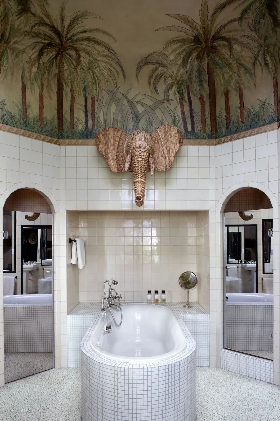 棕榈树林与一个藤编的大象主题装饰引入了宏伟低调的热带气质,但空间的中性色背景却让人感觉温暖。掏空的壁龛提供了独特的储物空间,而两面镜子则放大了空间。