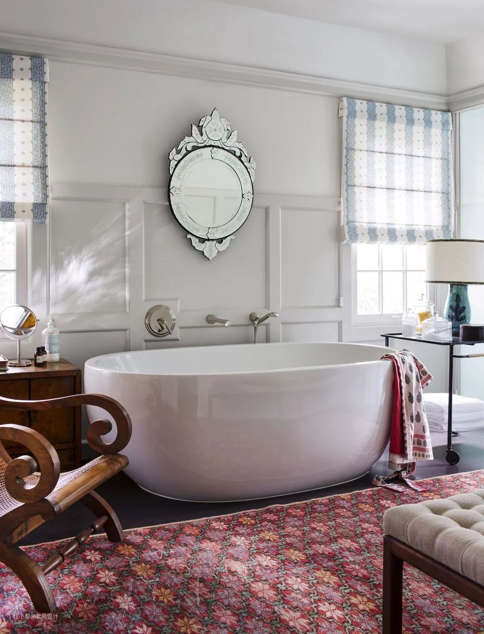 换下浴室垫,换上大尺寸的地毯,就像在此家中所示的老式地毯一样,它可以让你放心地在浴室里赤足行走,这会大大提升性感指数。