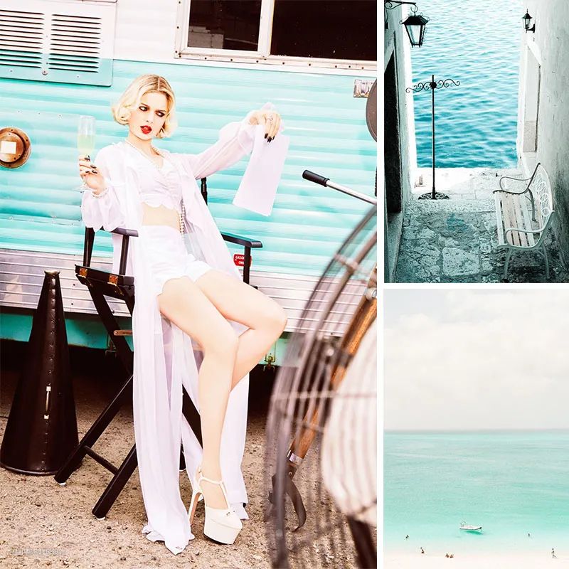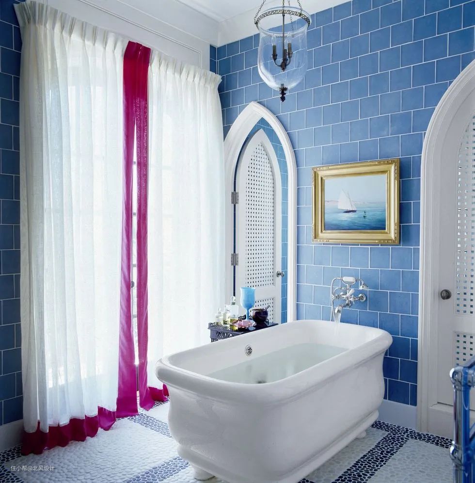 这间浴室的墙壁使用了地下铁风格的瓷砖——但是这次是彩色的。蓝色和白色创造出活力十足的海洋感,清新而现代,细绒窗帘上紫色的边缘打破了宁静,引入精致的女性气息,甚至还有一丝异域的魅惑情调,这在白色的拱门和落地镜上也可以得到印证。