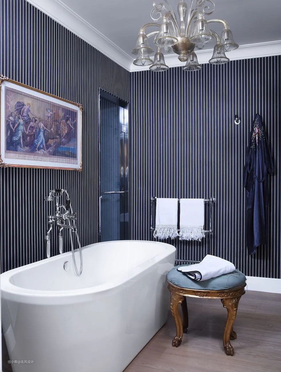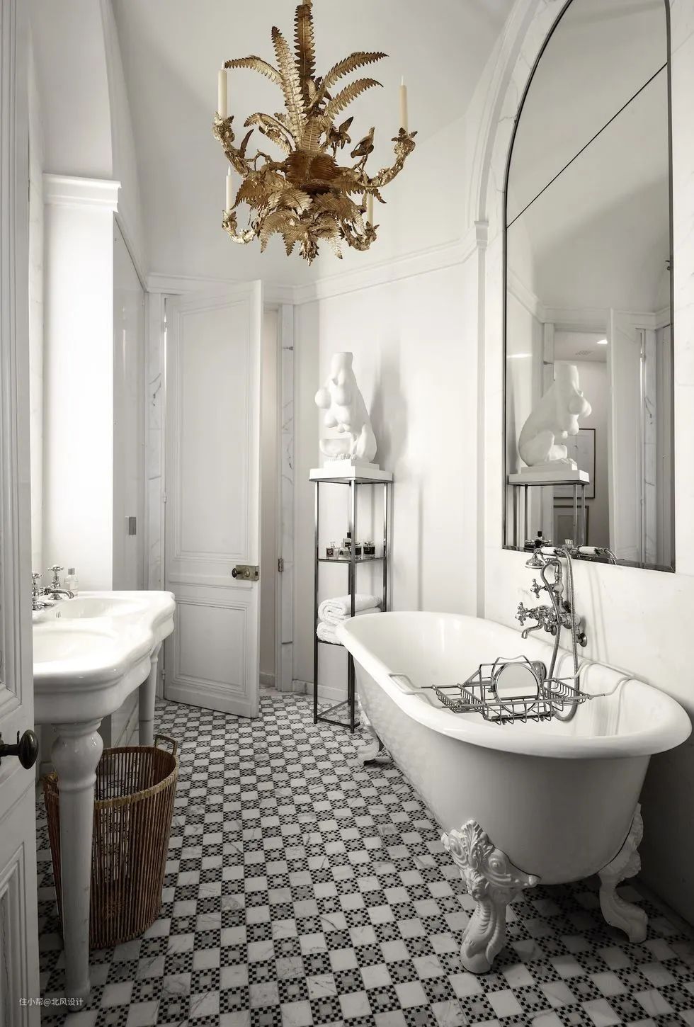 公寓里展示的。金色的吊灯与黑白色的外观形成了鲜明的对照,一盏别致的吊灯就像一个风格的微型灯塔,瞬间提升浴室的档次。
