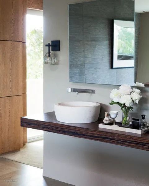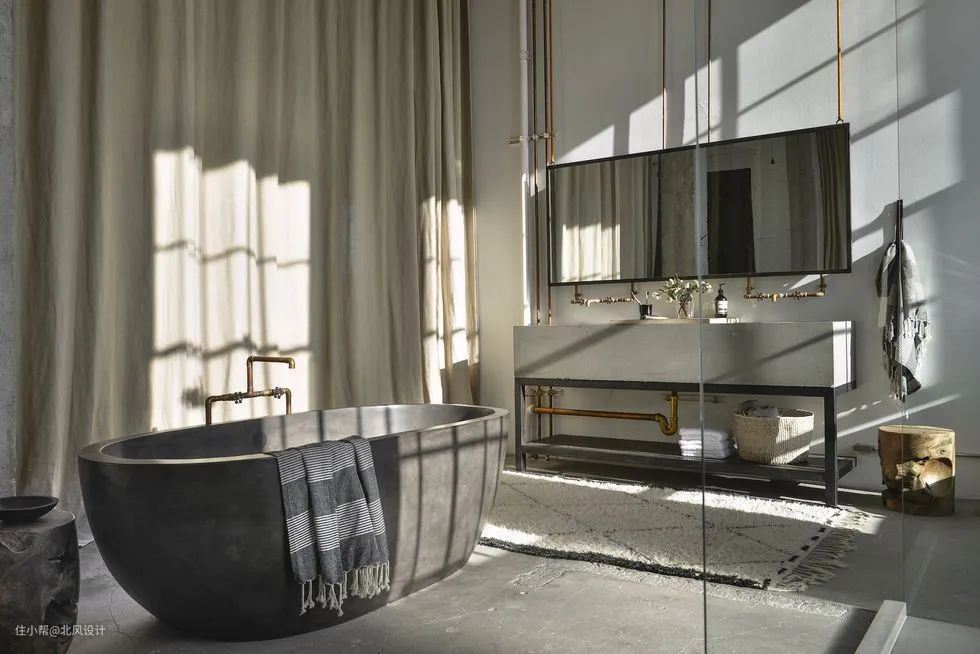 浴室内,一个黑石浴缸和天然小径,以及全中性色调营造出宁静的绿洲。