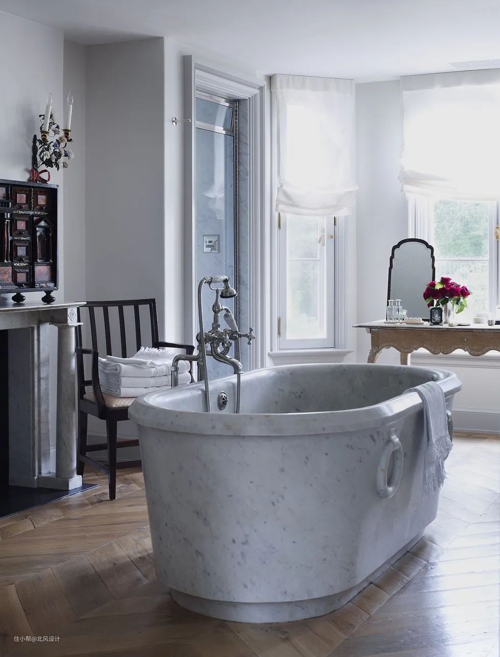 这一季,漂亮的浴缸将成为中心舞台。冷清的灰色调与人字纹抛光木地板形成了一种细腻的对比,法式古董家具在冰川灰的背景上渗透着古典之美。一个提示:选择浴缸的位置时,考虑隐私和你可以看到的风景。