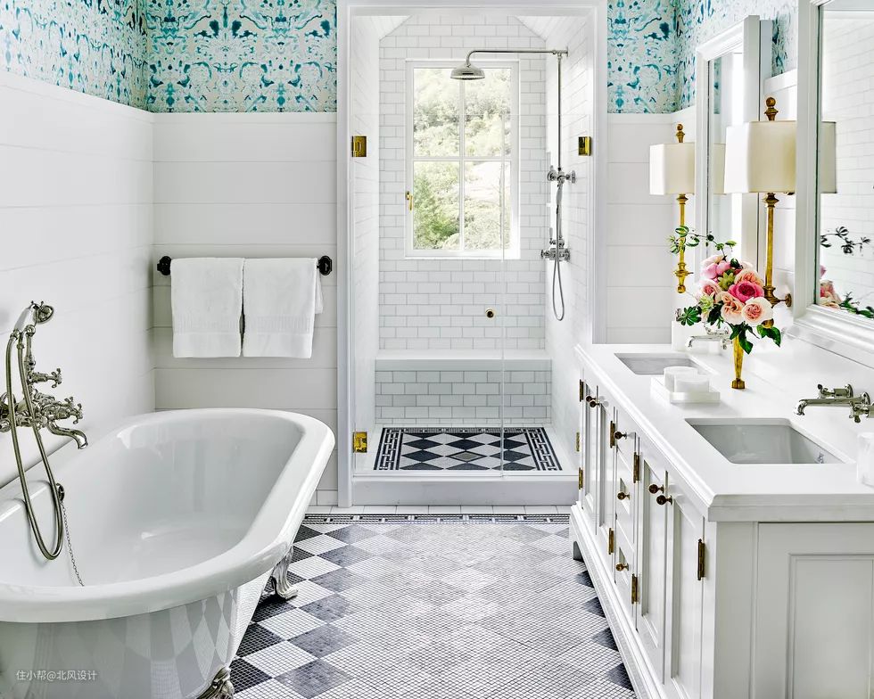 黑白格子地板铺上马赛克瓷砖后立刻让人感觉耳目一新,棋盘格的经典外形结合了马赛克瓷砖的防滑性能,展示出一种独特的新时尚,同时兼顾安全,防止在湿漉漉的地面上不小心滑倒。淋浴间的地面也以较小的尺寸重复了这一模式。