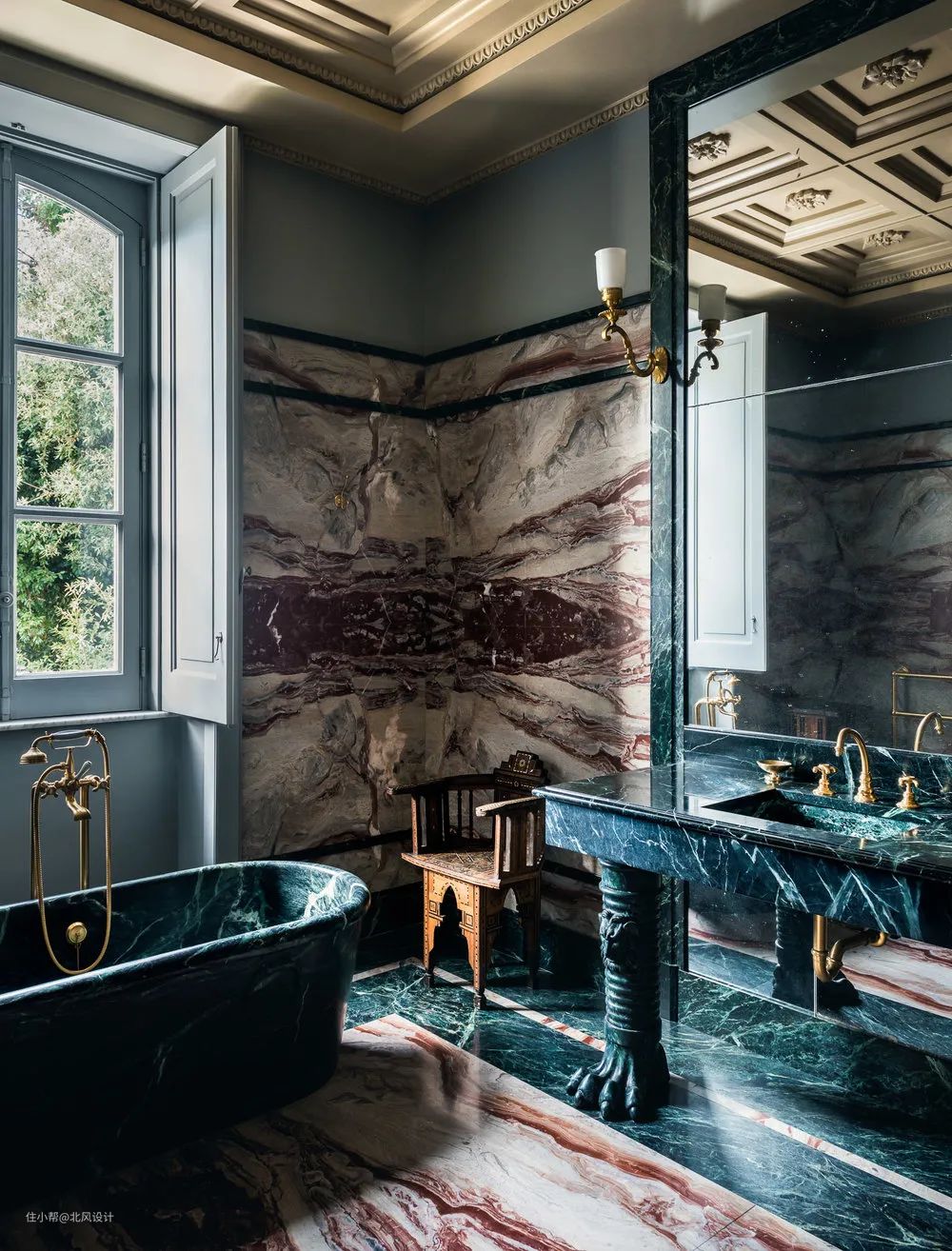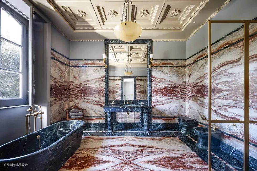 说到大理石,颜色越多越好——不仅仅是基本的黑色和白色。 整个浴室内都被红色和深绿色的大理石表面包裹,展示出粗犷而精致的魅力。
