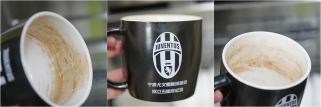 当然,真正让母上败下阵来,默默接受机洗强过手洗的,还是洗水杯和透明玻璃制品时带来的震撼感!就这样一个沾满茶渍的水杯,经过洗碗机洗涤之后,脱胎换骨,锃亮如新 ▲