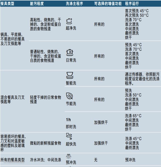 这里楼主依旧以西门子的洗涤程序为例——因为只有西门子把每一种不同模式对应的详细程序以及适用的场景都以图表的形式详细列了出来 :