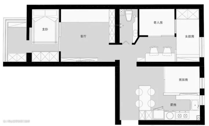 虽然面积很小,但是满足了三代同堂同时居住的需要。老人和两个孩子独立的居住空间都是分开来的。先看一下平面图:
