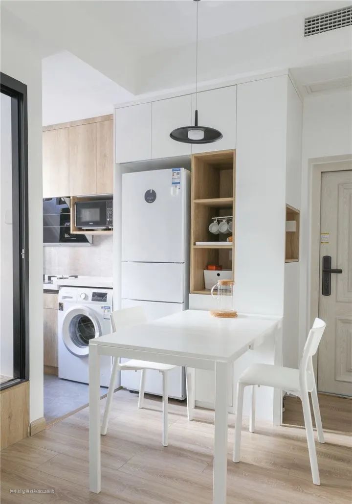 冰箱放餐边柜里,不占空间。可以折叠的餐桌,不用可以收起来。