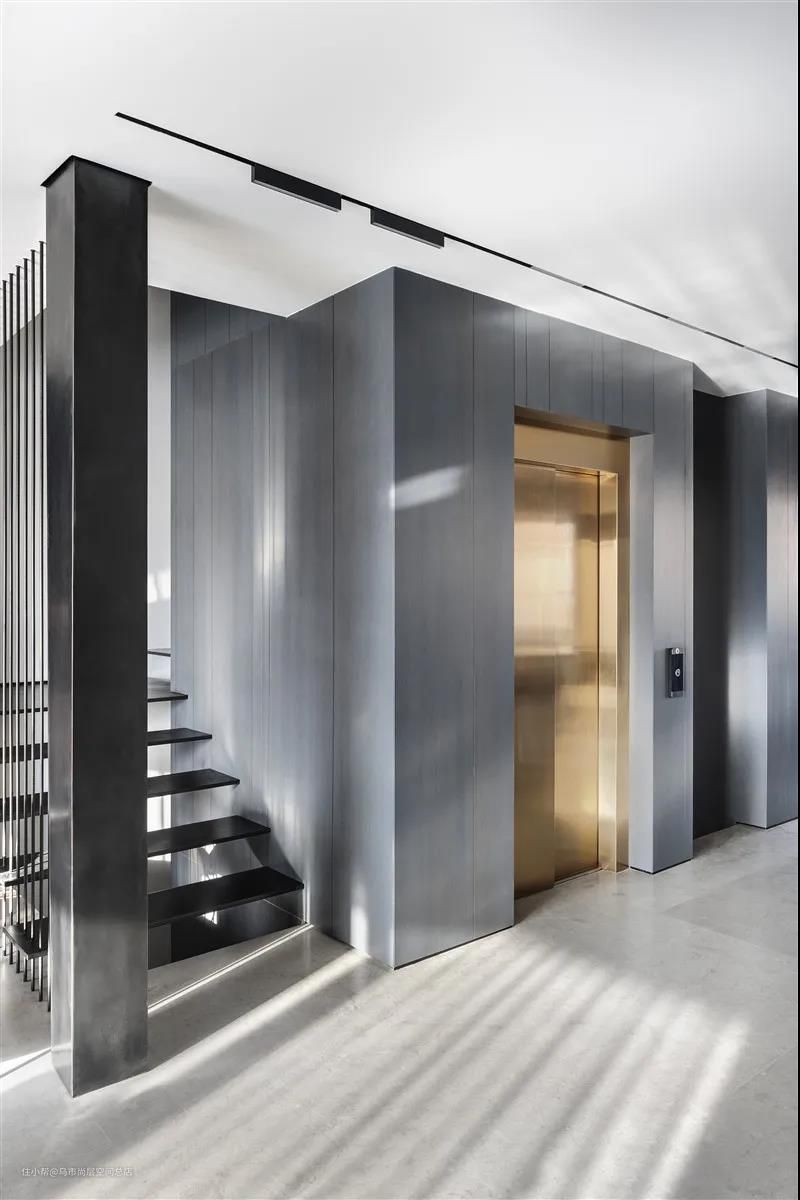 按照业主的需求,设计师在此加入了升降电梯的设计,并以金色视觉呈现,令其迅速从单一的立面区域跳脱出来,形成鲜明的对比。