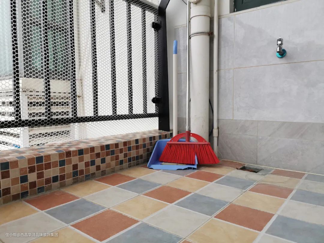 ▲阳台角落位置放拖把扫把。