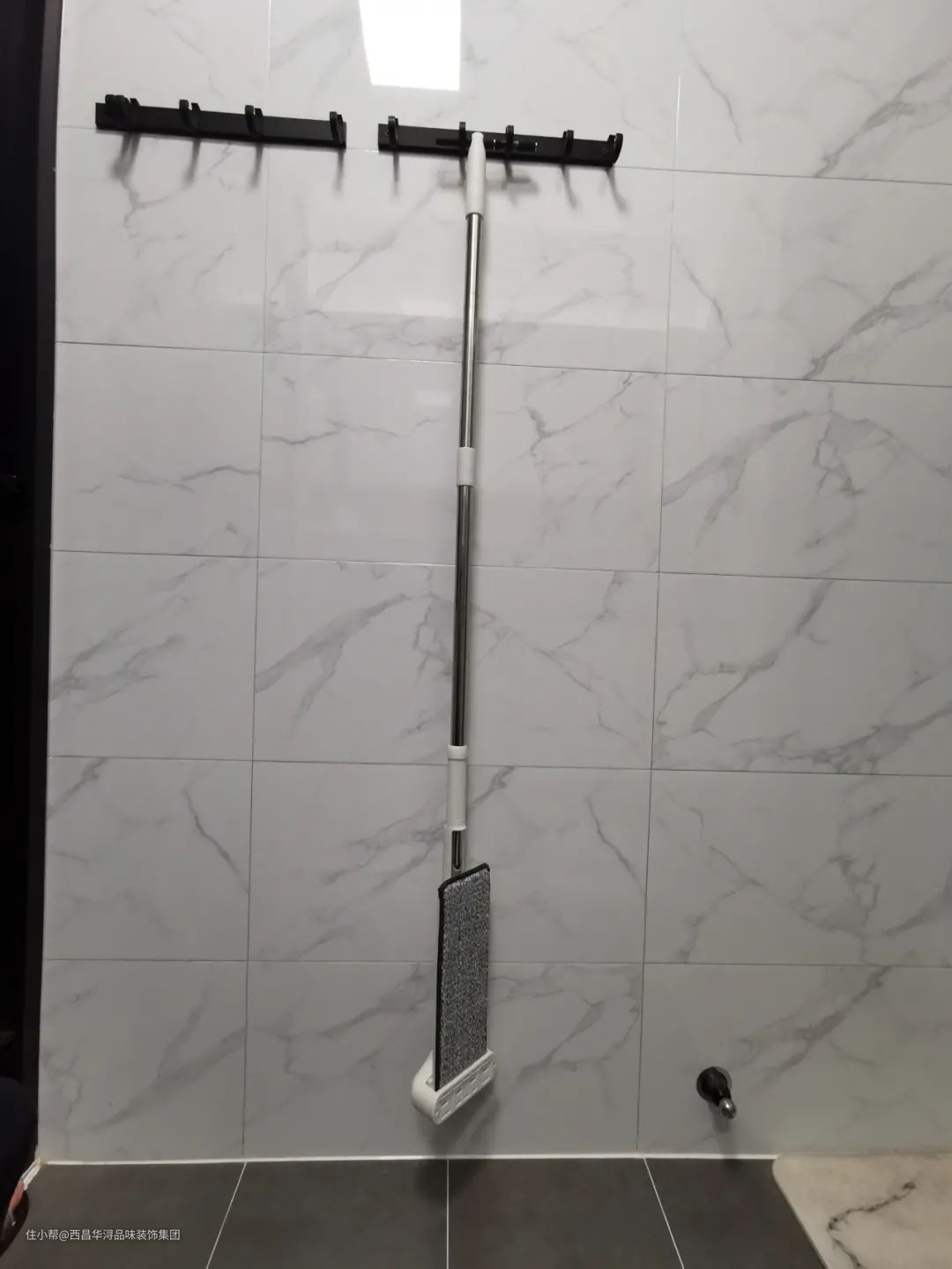 ▲如果卫生间有合适的空墙,装上挂钩也可以收纳拖把扫把。